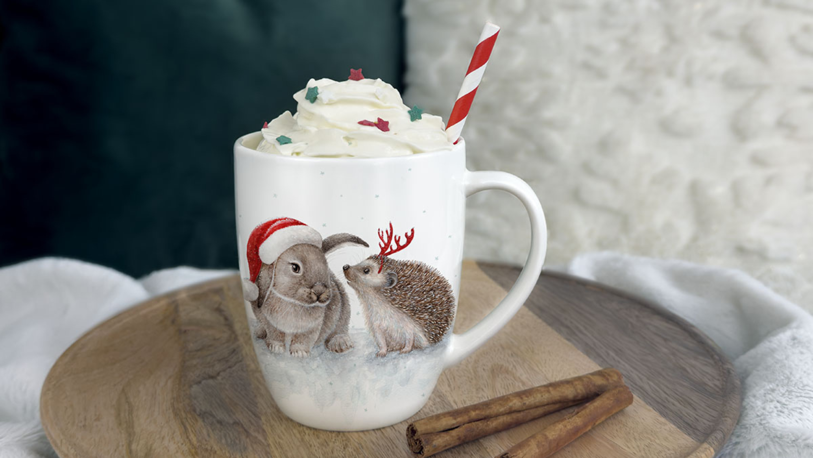 Auf der limitierten Jahrestasse und Jahreskugel ist 2025 das Motiv "Winter Walks" von Wrendale Designs.