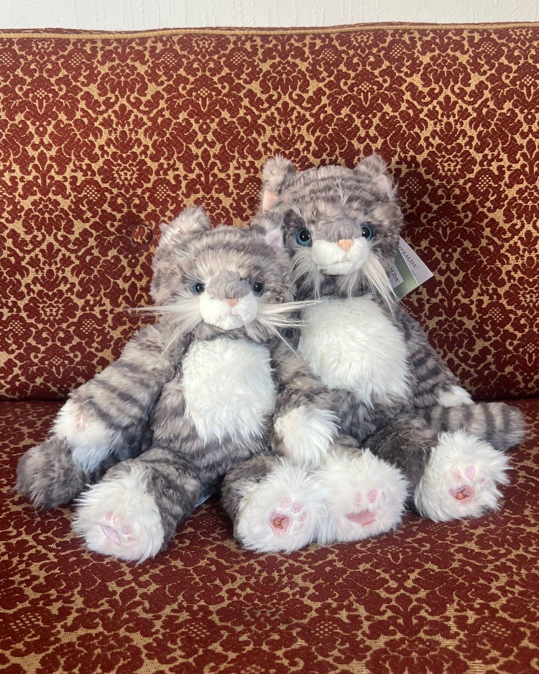Katzen Kuscheltiere Esmeralda nebeneinander in den Größen M und L von Wrendale Designs.