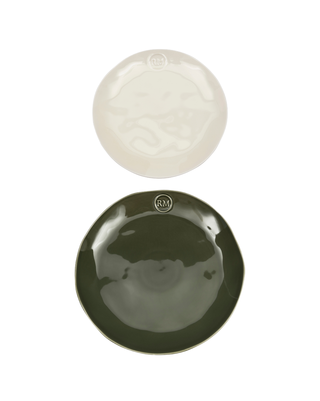 Dunkelgrüner Essteller Portofino von Rivièra Maison mit organischer Form und RM-Emblem vor weißem Hintergrund.