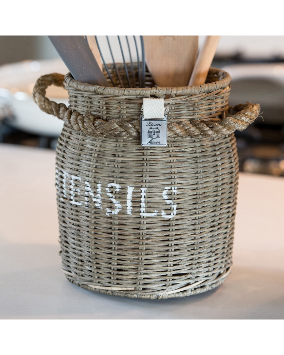 Der handgeflochtene Charakter verleiht dem Utensilienhalter eine warme, authentische Ausstrahlung.Kochlöffel, Schneebesen und Pfannenwender sind griffbereit verstaut und gleichzeitig dekorativ präsentiert.