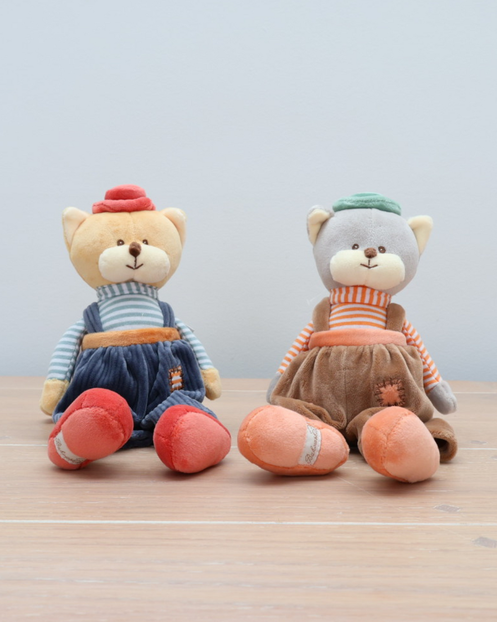 Die Katzen Kuscheltiere Ben & Remi von Bukowski erobern jedes Herz im Sturm. Mit ihren fröhlichen Gesichtern, den gestreiften Shirts, Latzhosen mit Patch-Details und kleinen Mützen sind sie nicht nur zum Kuscheln da, sondern auch ein liebevoller Hingucker im Kinderzimmer.