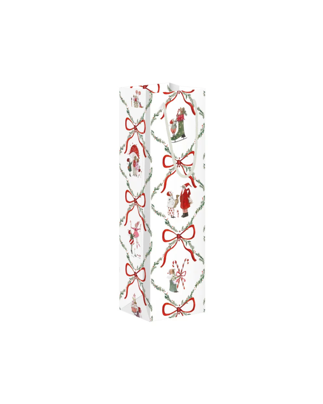 • Flaschentasche: elegant gestaltet mit weihnachtlichen Ranken, zwischen denen sich Elfen und Nikoläuse tummeln.
