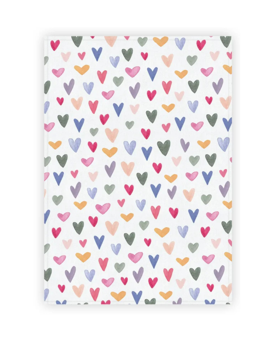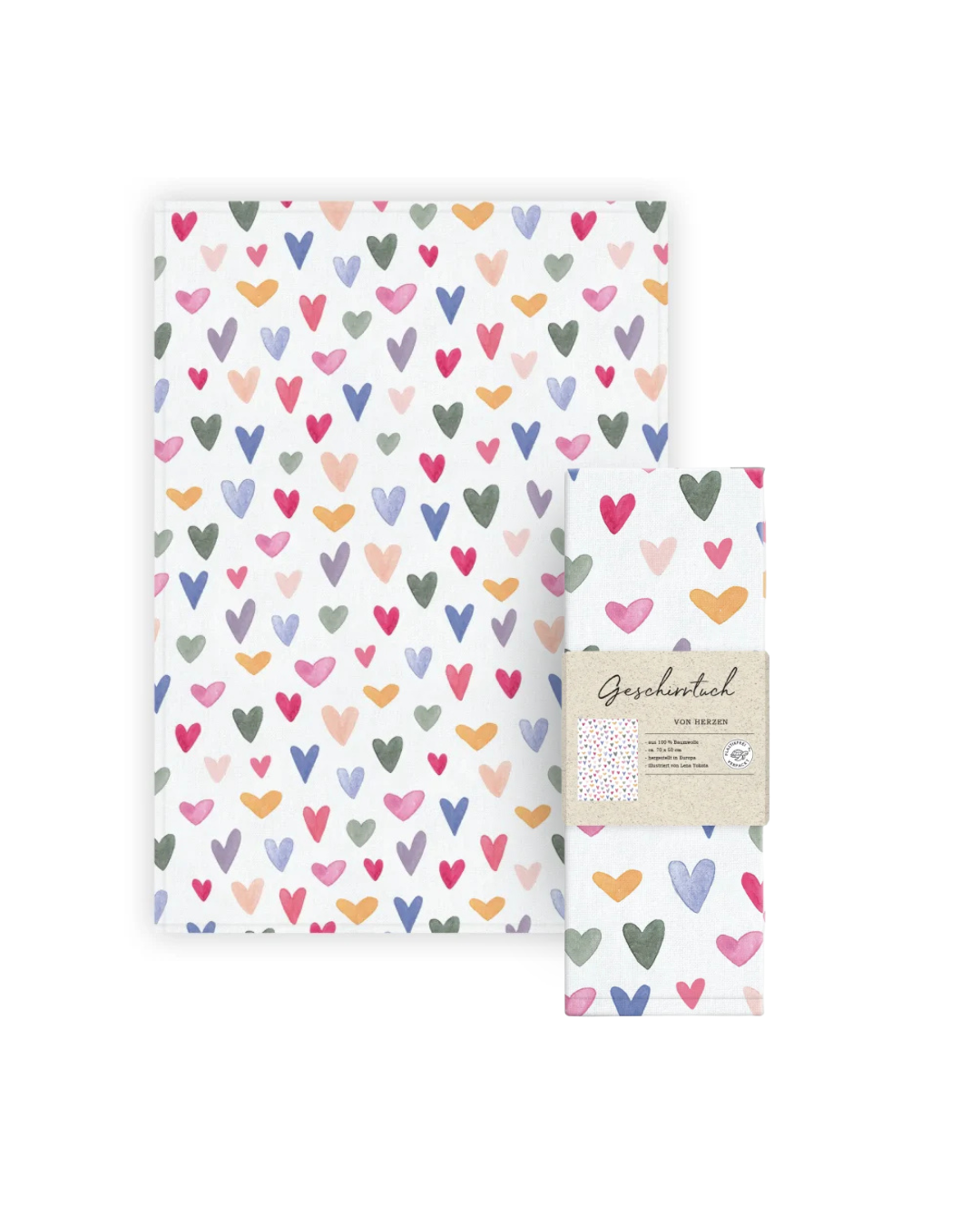 Geschirrtuch „Von Herzen“ vom Grätz Verlag mit dicht verteilt dargestellten, bunten Herzmotiven auf hellem Hintergrund, flach ausgelegt und frontal fotografiert.