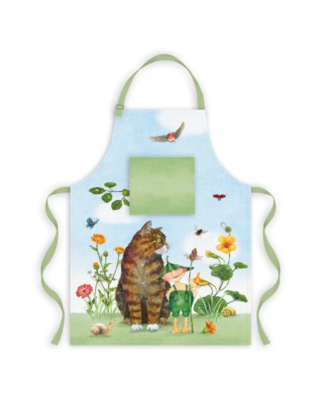 Die liebevoll gestaltete Giesbert Kinderschürze zeigt den beliebten Wichtel Giesbert und seine Freunde in einer fröhlichen Gartenszene. Perfekt für kleine Köche, die mit Freude und Fantasie in der Küche helfen.