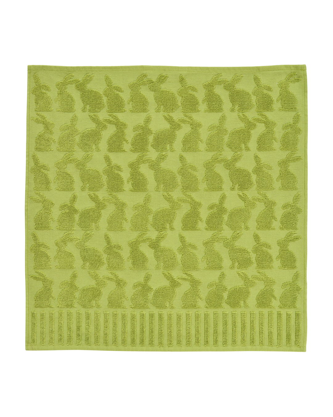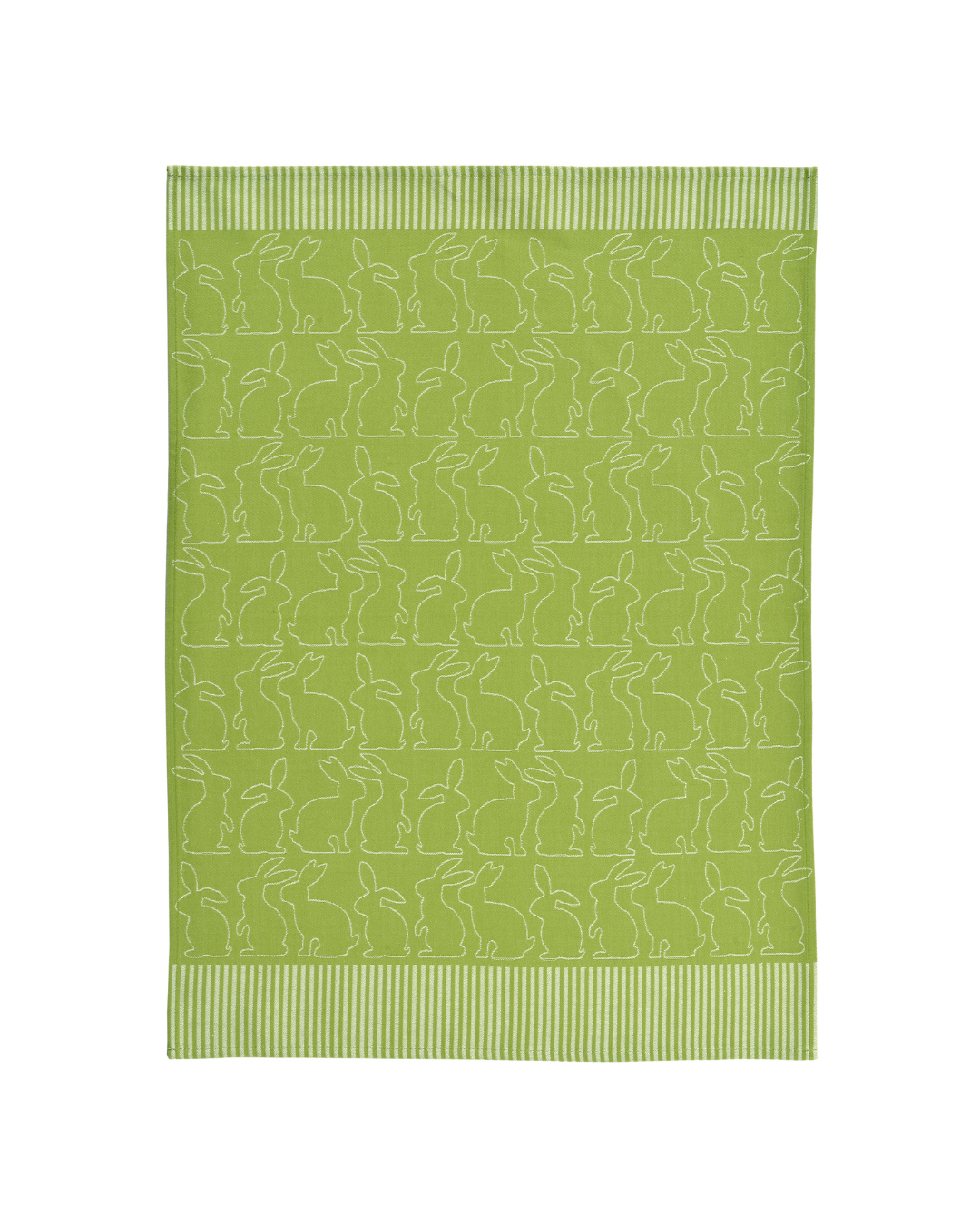 Grünes Geschirrtuch „Pascha“ von Sander mit eingewebtem Hasenmotiv und gestreiftem Abschluss, flach ausgebreitet vor weißem Hintergrund.