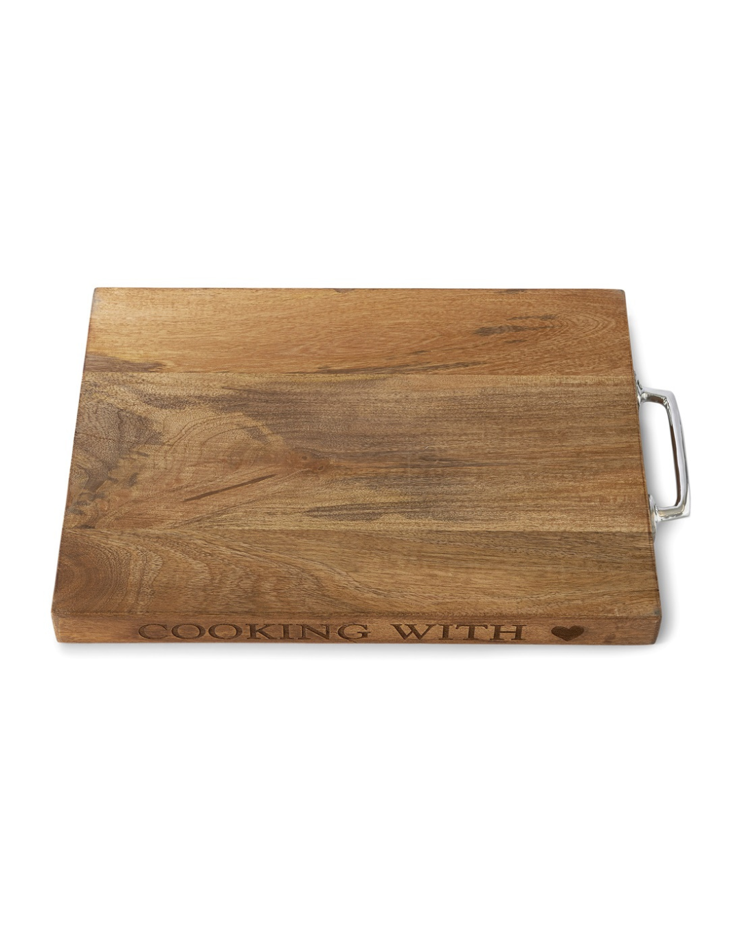 Schneidebrett „Cooking with Love“ von Rivièra Maison aus Holz, freigestellt vor weißem Hintergrund mit Griff und Schriftzug.
