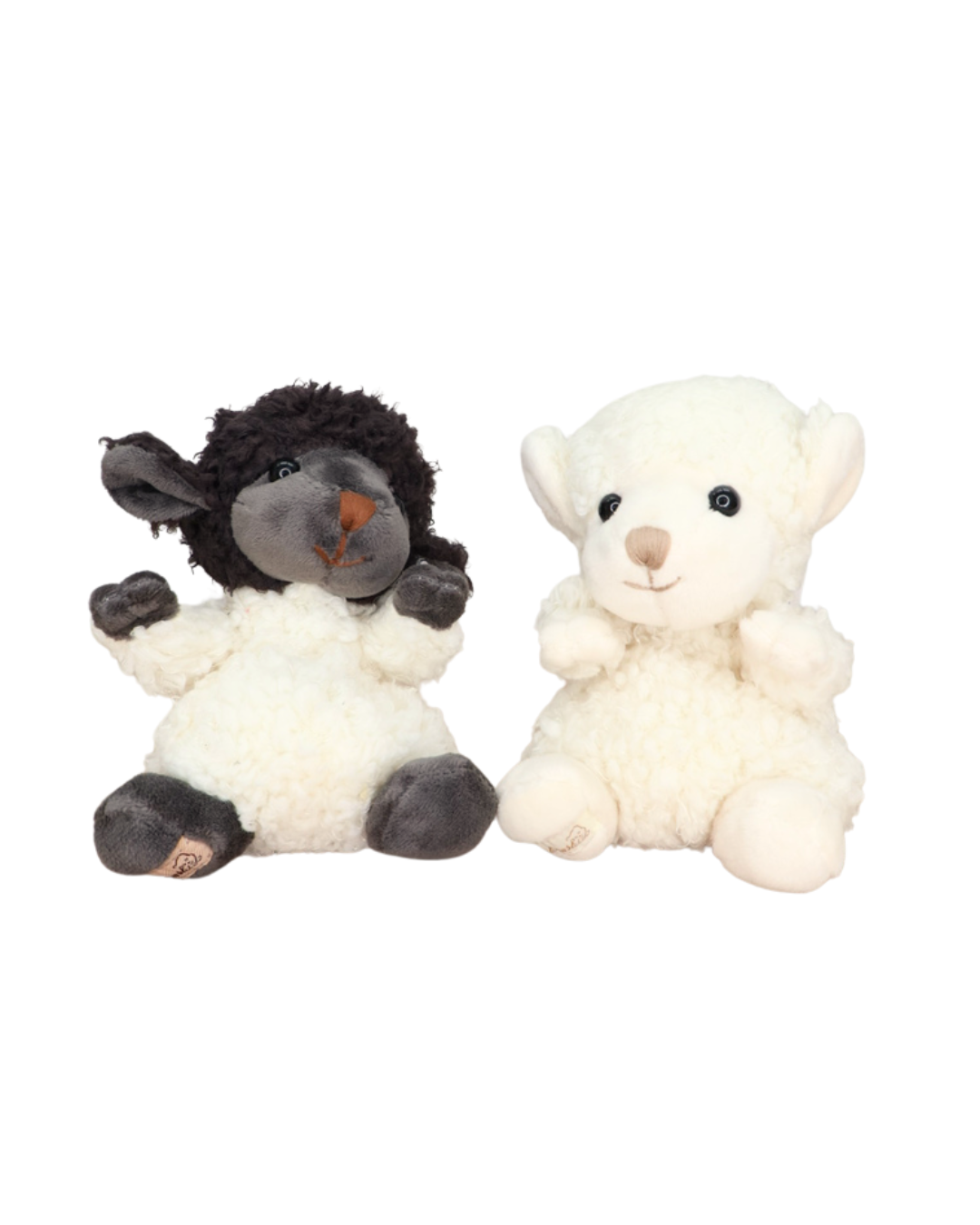 Zwei Schafs Kuscheltier von Bukowski sitzen auf weißem Hintergrund. Eines mit schwarzen Akzenten und eines ganz Weiß das lockige Fell und die freundlichen Augen sind gut zu erkennen.