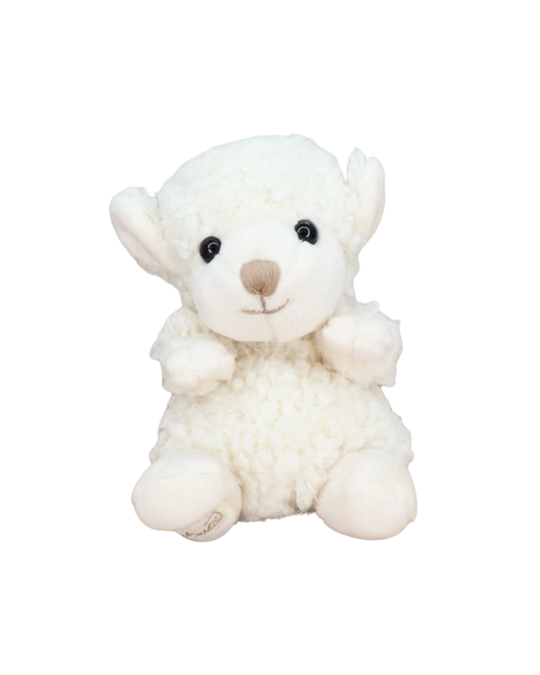 Ein weißes Schaf Kuscheltier von Bukowski sitzt auf weißem Hintergrund. Sein lockiges Fell und die freundlichen Augen sind gut zu erkennen.