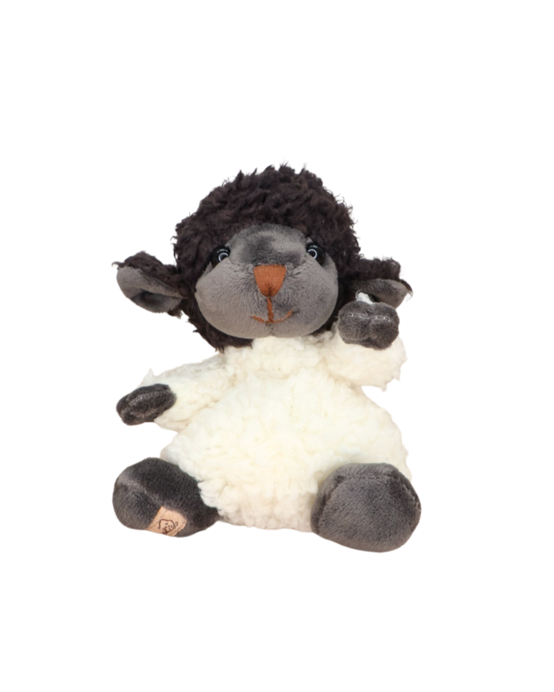 Ein schwarzes Schaf Kuscheltier von Bukowski sitzt auf weißem Hintergrund. Sein dunkles Gesicht und die lockige Wolle sind im Detail zu sehen.