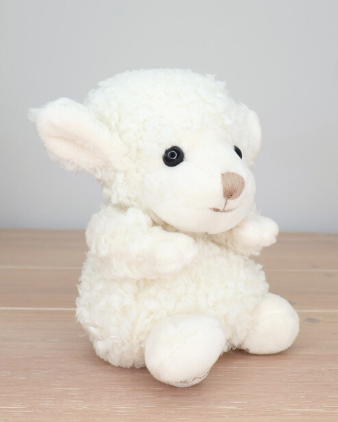 Ein weißes Schaf Kuscheltier mit schwarzen Augen von Bukowski sitzt auf einem hellen Holzboden.