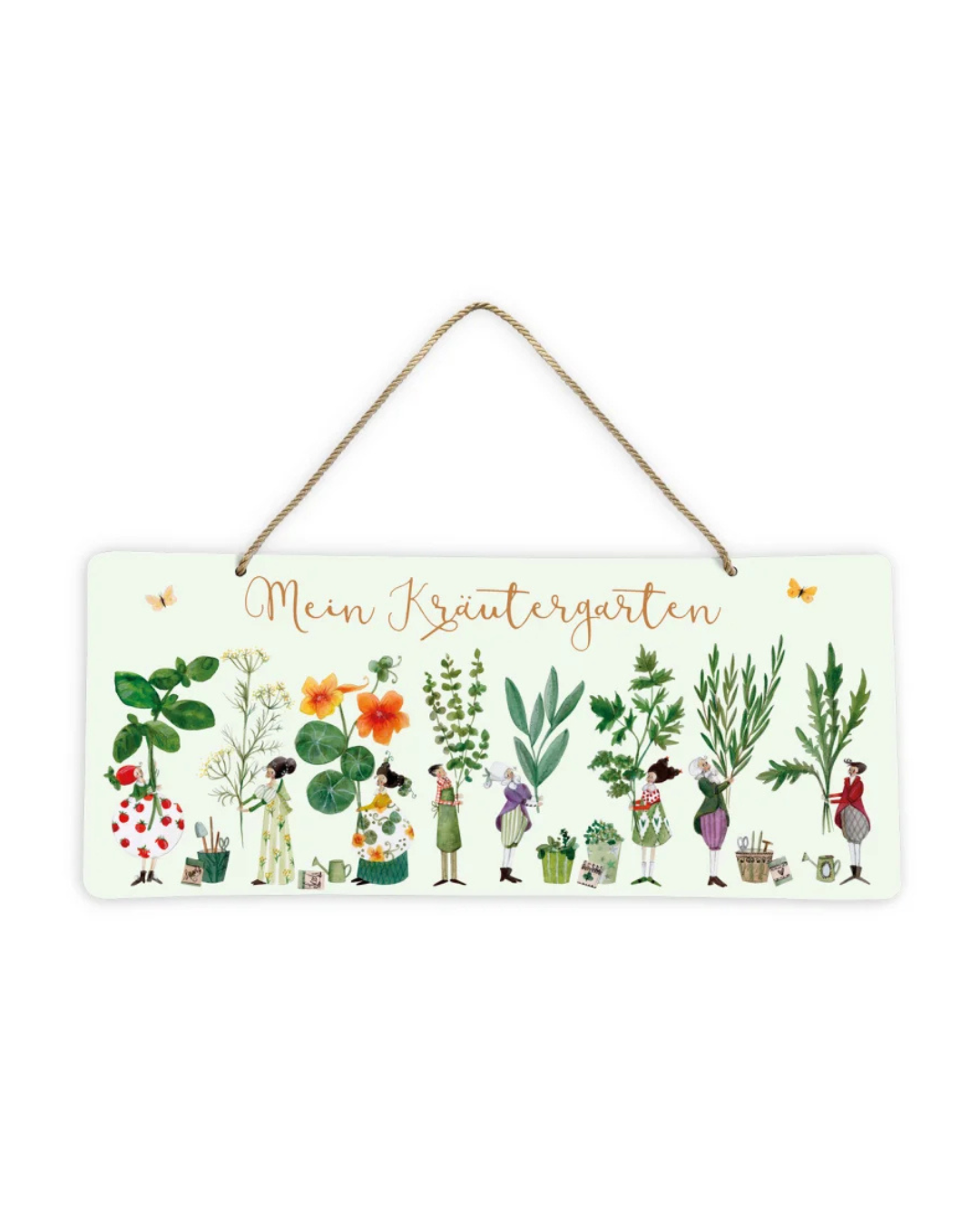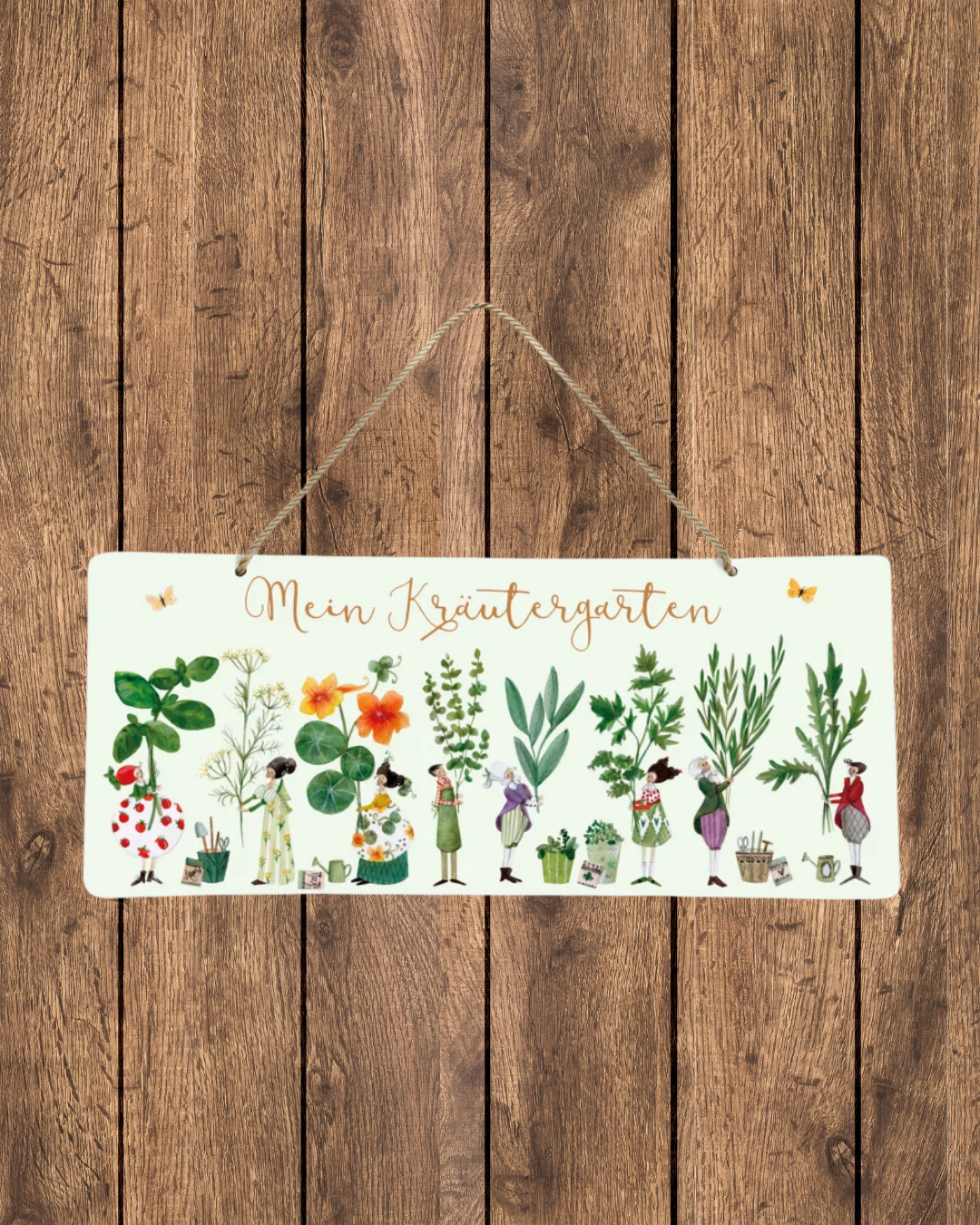 Metallschild „Kräutergarten“ vom Grätz Verlag an einer Holzwand aufgehängt, mit illustrierten Kräutern, kleinen Figuren und Schriftzug „Mein Kräutergarten“, befestigt mit Kordel.