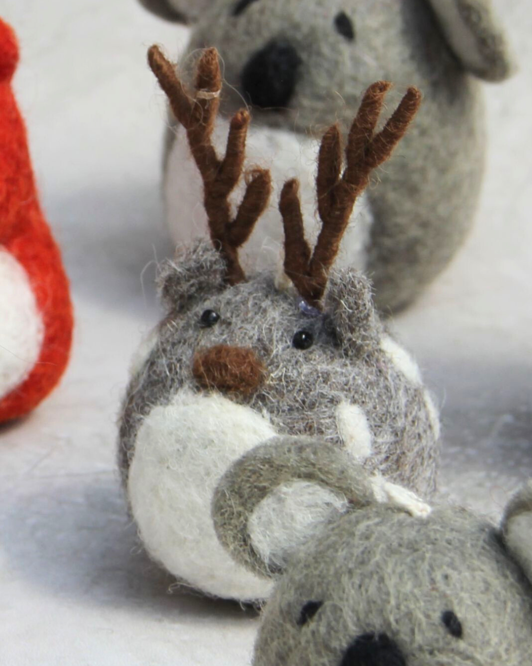 Handgefilzter Rentieranhänger mit weißem Bauch und Flecken