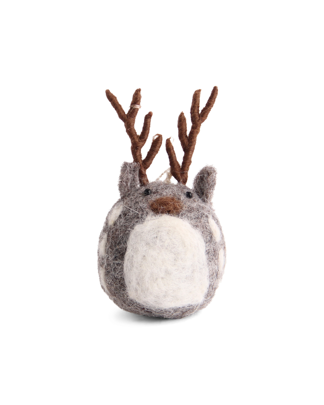 Das graue Rentier von Gry & Sif ist ein kleiner Winterfreund, der im Nu Weihnachtsstimmung verbreitet. Mit seinem runden Körper, den süßen weißen Flecken und den filigranen, handgefertigten Geweih-Ästchen wirkt es wie ein Bewohner eines verschneiten Zauberwaldes. Liebevoll aus Filz gefertigt, bringt es skandinavische Gemütlichkeit an deinen Weihnachtsbaum, auf Deko-Zweige oder als kleines Highlight in winterliche Arrangements. Ein charmanter Begleiter für die Adventszeit – verspielt, weich und einfach zum Verlieben.