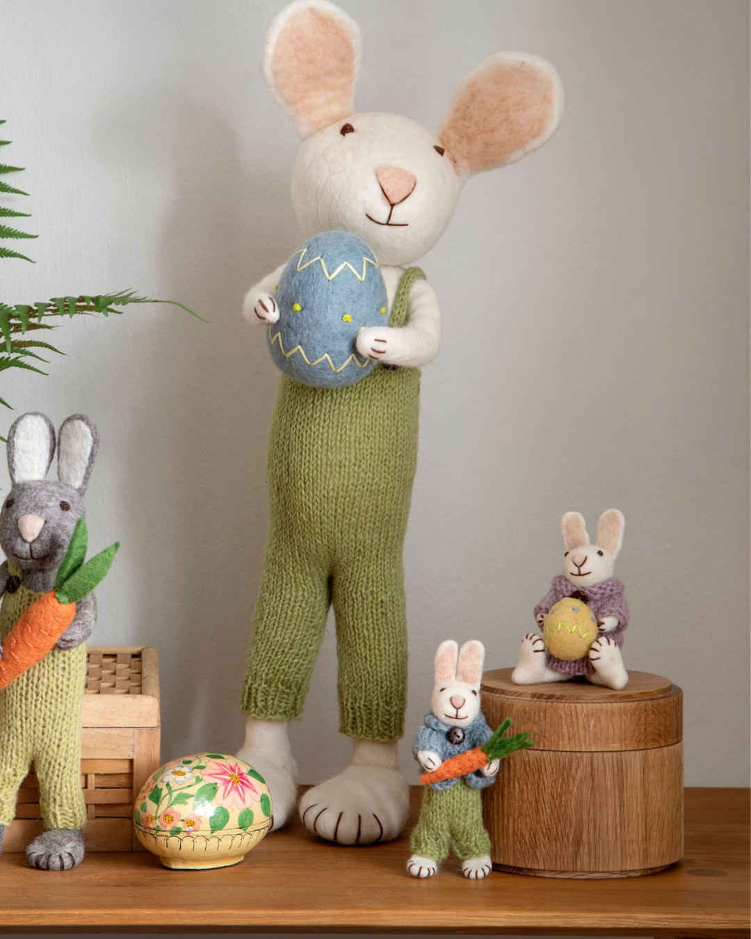 Mehrere handgefilzte Hasen und Osterfiguren von Gry & Sif dekorativ auf einem Holztisch arrangiert, frühlingshafte Szene mit natürlichen Farben.