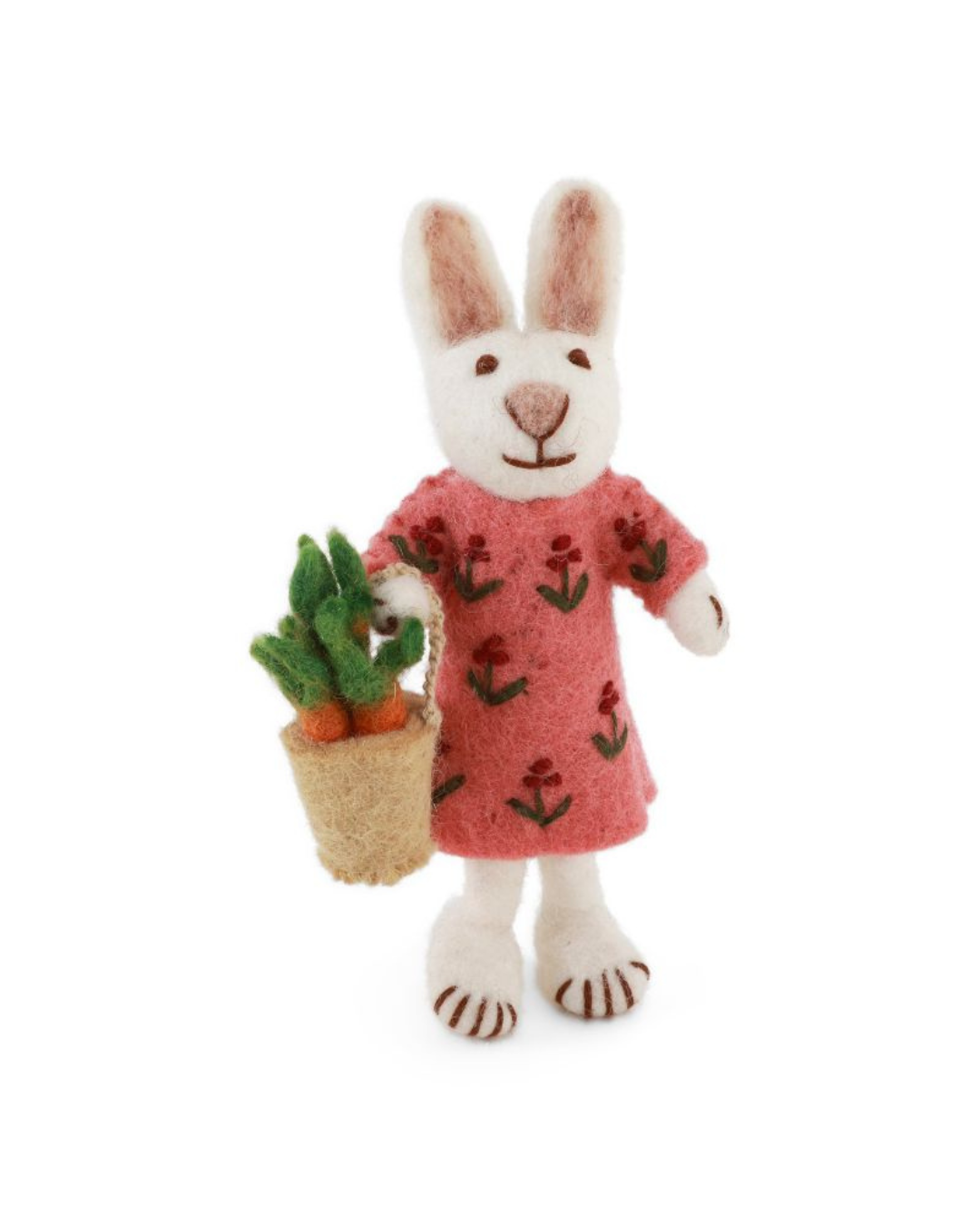 Einzelner Filzanhänger Hase im rosafarbenen Kleid mit Karottenkorb von Gry & Sif, freigestellt vor weißem Hintergrund.