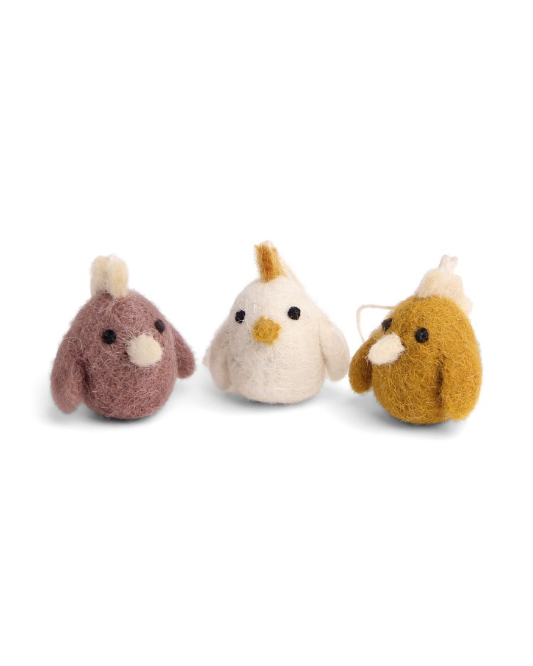 Drei Filzhühner als Anhänger von Gry & Sif in unterschiedlichen Naturtönen nebeneinander vor weißem Hintergrund.