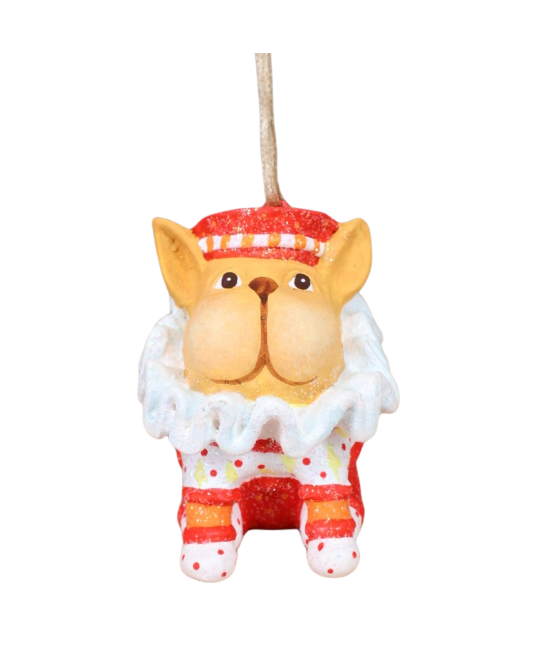 Der Mini French Bulldog von Patience Brewster bringt fröhlichen Krinkles-Zauber direkt an deinen Weihnachtsbaum. Mit seinem niedlichen Gesichtsausdruck, der verspielten Rüschenkleidung und den leuchtenden Farben wirkt er wie ein kleiner festlicher Begleiter. Jede Figur wird liebevoll handbemalt und zeigt die typischen, fantasievollen Details der Künstlerin. Ideal für Sammlerinnen und Sammler, die sich an außergewöhnlichen Figuren erfreuen. Dieser kleine Hund sorgt garantiert für ein warmes Lächeln und weihnachtliche Stimmung in deinem Zuhause.