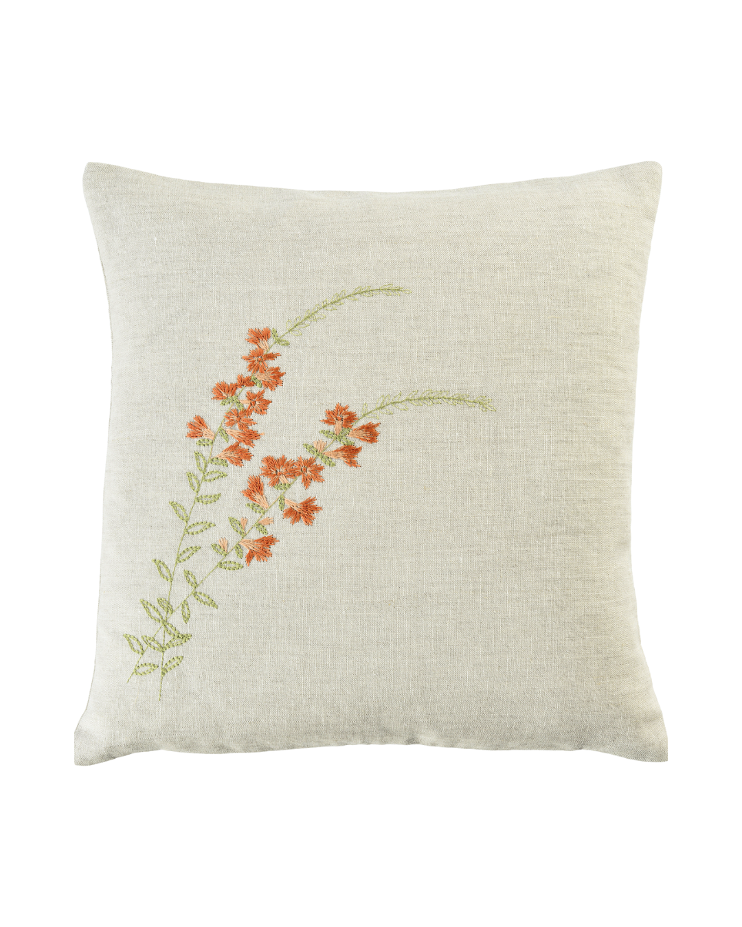 Leinen-Kissenbezug „Sunny Meadow“ von Sander mit korallenfarbener Blumenstickerei auf hellem Naturstoff.