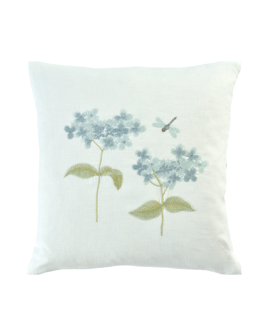 Weißer Leinen-Kissenbezug „Damsel“ von Sander mit blauer Hortensien-Stickerei und kleiner Libelle auf der Vorderseite.