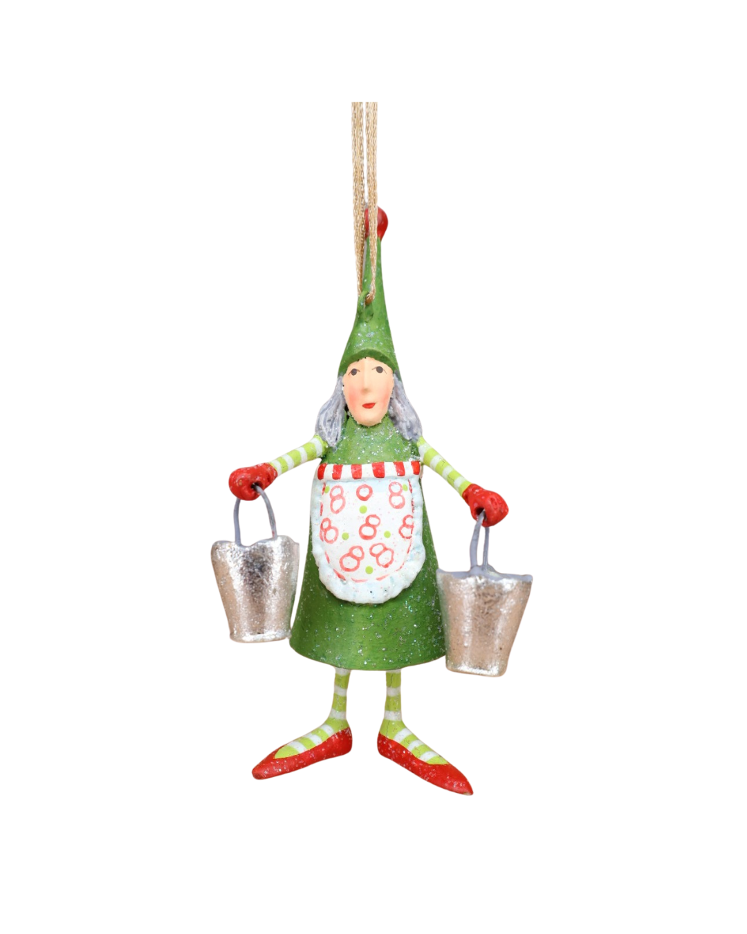 Tannenbaum Krinkle Mini Maid A Milking von Patience Brewster – Seitenansicht mit silbernen Eimern und spitzer grüner Mütze