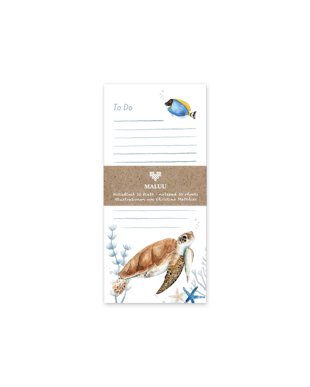 Der Notizblock „Sealife“ von Maluu bringt maritimes Flair auf deinen Schreibtisch. Liebevoll von Christine Matthies illustriert, zeigt er eine sanft dahingleitende Meeresschildkröte und einen leuchtend blauen Fisch zwischen Seegras und Muscheln. Die zarten Aquarellfarben schaffen eine beruhigende Atmosphäre, perfekt für deine täglichen To-dos oder kreativen Gedanken. Mit 50 linierten Blättern ist dieser Block ein stilvoller Begleiter im Alltag.