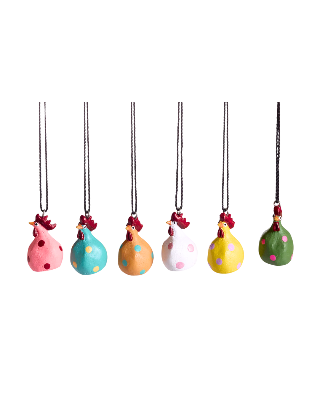 Mehrere hängende Hühner „Poppy“ von Nääsgränsgården in verschiedenen Farben mit Punkten an schwarzen Bändern