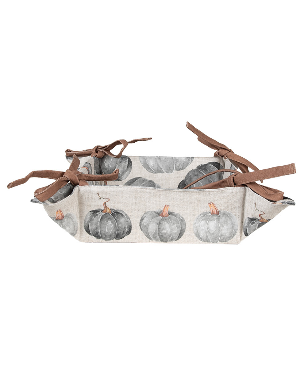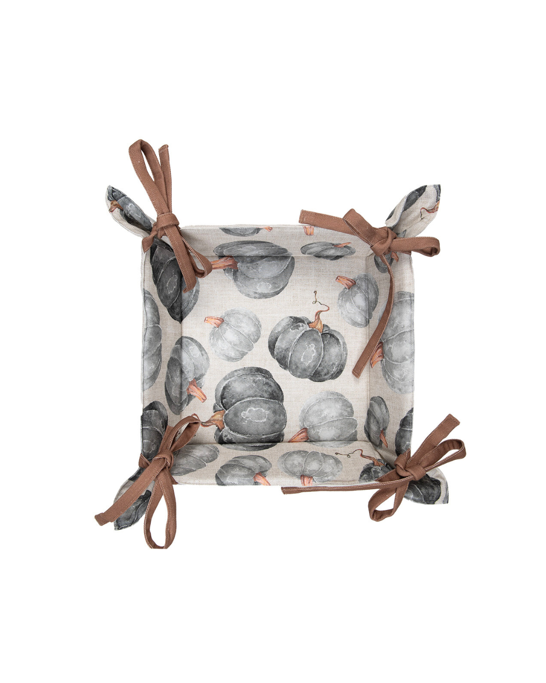 „Rechteckiges Brotkörbchen Kürbis von Clayre & Eef 35 x 35 x 8 cm mit grauen Kürbissen und Schleifen an den Ecken“