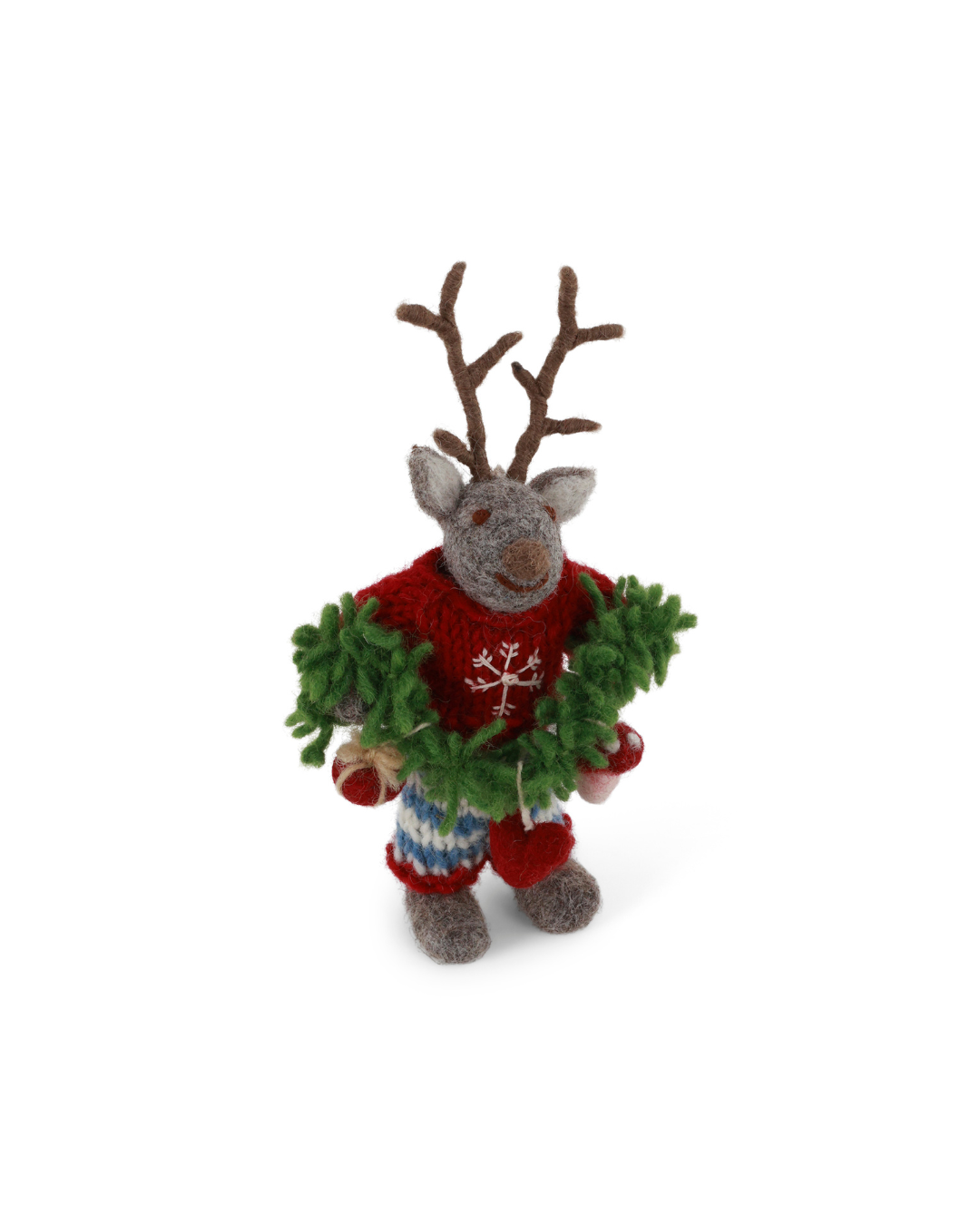Dieses kleine Rentier mit Girlande von Gry & Sif bringt liebevollen, handgemachten Weihnachtszauber in dein Zuhause. Mit seinem gestrickten roten Pullover, den hübschen Filzdetails und der festlichen grünen Girlande verbreitet es sofort winterliche Vorfreude. Ob am Weihnachtsbaum, als Deko auf dem Sideboard oder zusammen mit weiteren Filztieren — dieses Rentier sorgt für ein warmes, hyggeliges Ambiente.
