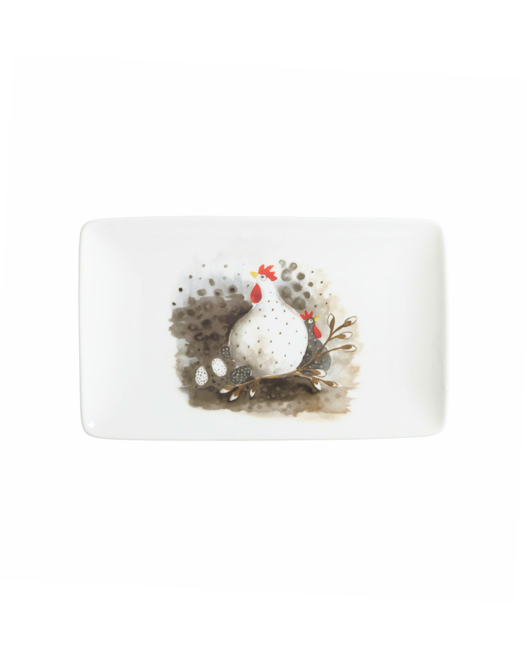 Der hübsche Hühnerteller besteht aus Porzellan.