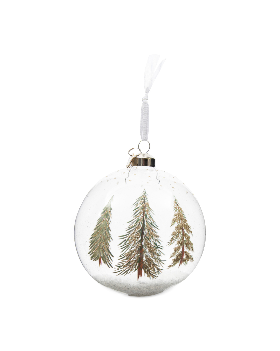 Die Weihnachtsbaumkugel Christmas Forest Ornament von Rivièra Maison bringt die festliche Magie eines verschneiten Winterwaldes direkt an deinen Baum. Die transparente Glaskugel ist mit detailreich bemalten Tannenbäumen verziert und mit feinem Schneeglitzer gefüllt, sodass sie wie eine kleine Winterlandschaft wirkt. Ein stilvolles Band rundet das elegante Design ab und macht dieses Ornament zu einem Highlight deiner Weihnachtsdekoration.