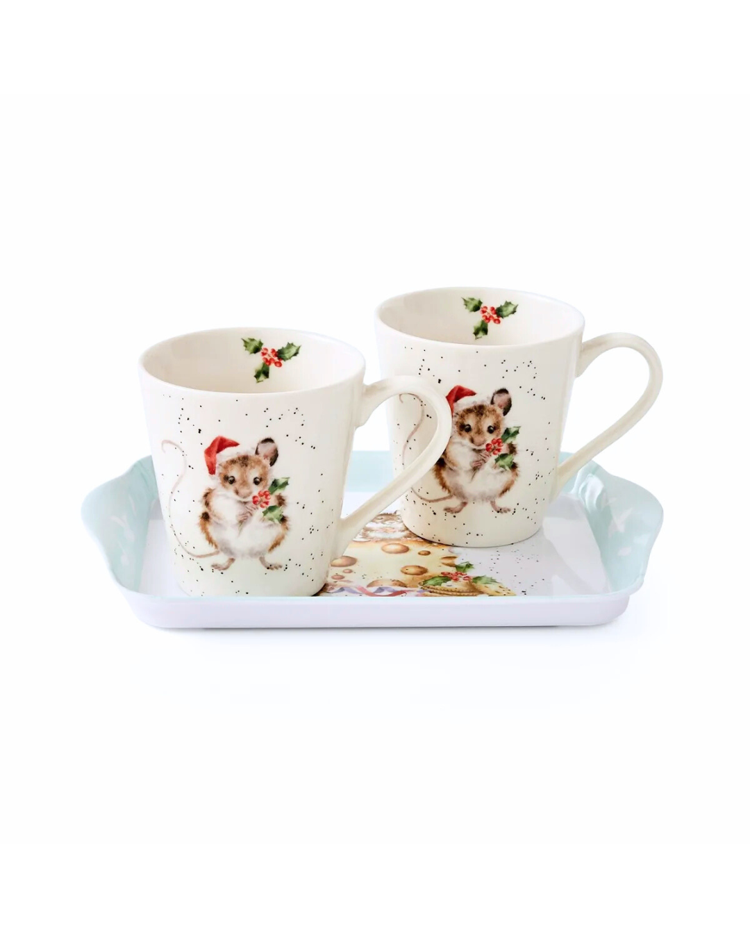 Weihnachtsmäuse „Holly Jolly“ auf zwei Tassen & einem Tablett von Wrendale Designs – festliches Motiv mit Mäusen und Käse vor weißem Hintergrund.