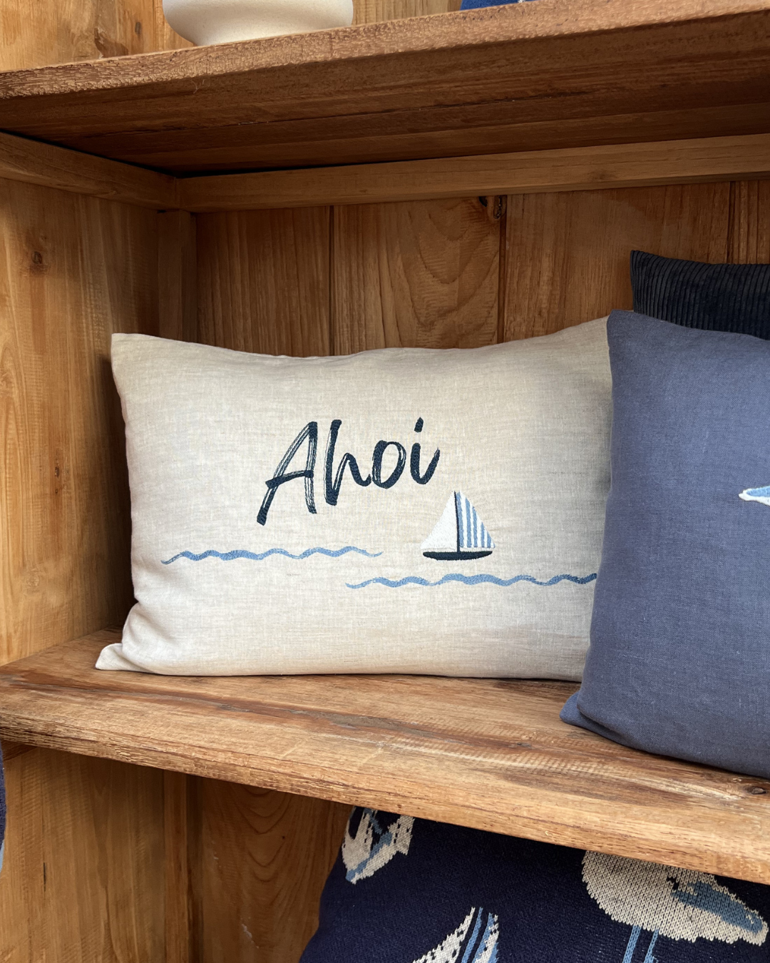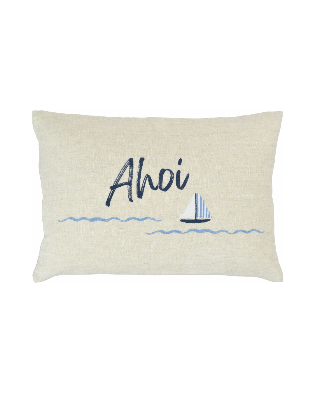 Der Kissenbezug Ahoi von Sander bringt maritimen Charme in dein Zuhause. Auf 100% reinem Leinenstoff sind Wellen, ein Segelboot und der Schriftzug "Ahoi" aufgestickt. Das 34 x 50 cm große Kissen ist die perfekte Kombination aus hochwertigem Material und sommerlicher Stickerei. Es macht deinen Lieblingsplatz zum stilvollen Highlight.