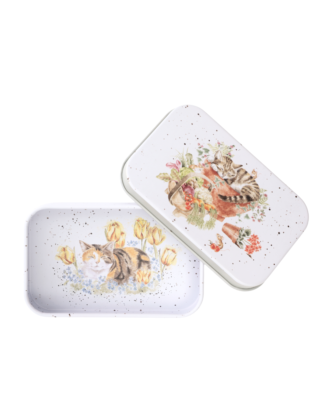 Geöffnete Katzen-Dose von Wrendale Designs mit zusätzlichem Katzenmotiv im Inneren, dekorative Aufbewahrungsdose