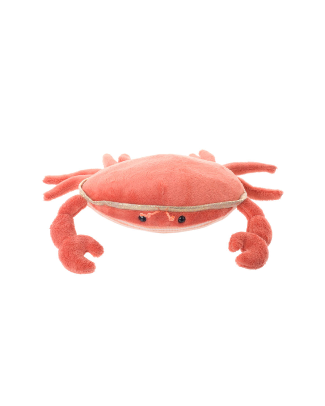 Weiche Kuschelkrabbe Jacques von Bukowski aus leicht erhöhter Perspektive, runder Körper mit goldfarbener Ziernaht und seitlich angesetzten Scheren.